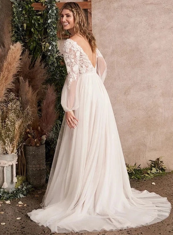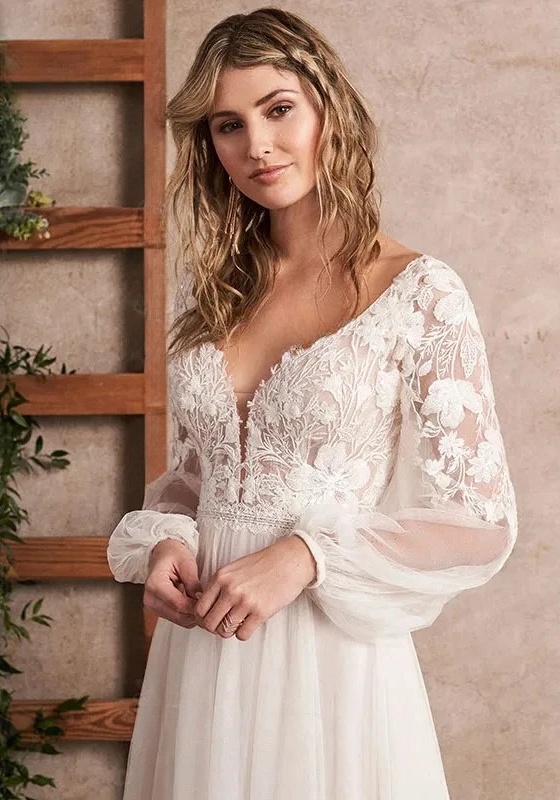 Dans une atmosphère douce et authentique, cette robe de mariée dévoile un romantisme bohème plein de délicatesse. Son corsage en dentelle florale finement travaillée, sublimé par un décolleté en V profond, met en valeur le buste avec féminité. Les manches longues en voile léger apportent une touche aérienne et élégante, tandis que la taille subtilement marquée équilibre la silhouette. La jupe longue et fluide s’étend avec grâce, offrant un tombé naturel et léger. Idéale pour une cérémonie intimiste ou un mariage au charme champêtre, cette robe s’accompagne parfaitement de bijoux délicats, d’une coiffure naturelle et d’accessoires doux pour une allure romantique et intemporelle.