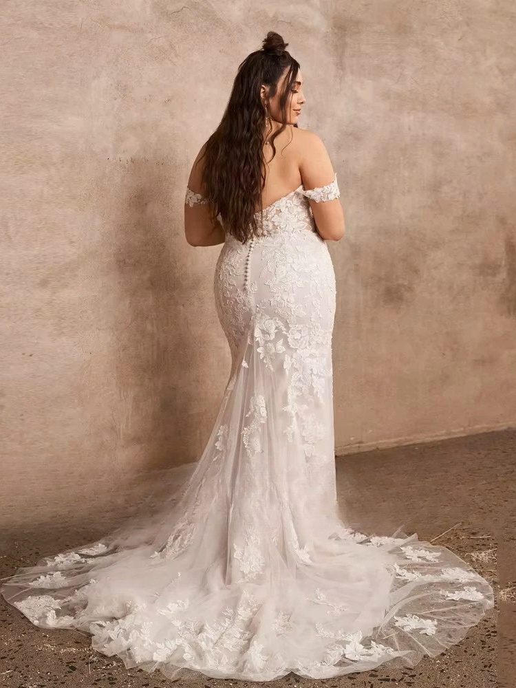 Sensuelle et sophistiquée, cette robe de mariée grande taille sublime vos courbes avec une élégance envoûtante. Son décolleté cœur délicatement structuré met en valeur le buste avec féminité, tandis que le corsage en dentelle finement brodée épouse la silhouette et souligne la taille avec précision. La coupe sirène dessine les formes avec harmonie avant de s’évaser subtilement vers le bas, créant une allure élancée et résolument glamour. Les détails floraux délicats apportent texture et raffinement, tandis que la traîne légère prolonge la ligne avec grâce. Confectionnée dans des matières souples et confortables, elle offre maintien et confiance pour vivre pleinement chaque instant. Photographiée dans un décor aux tons chauds et naturels, rehaussé de textures douces et d’éléments végétaux séchés, cette création évoque une cérémonie intimiste et élégante, où romantisme et modernité magnifient la beauté des courbes avec caractère.