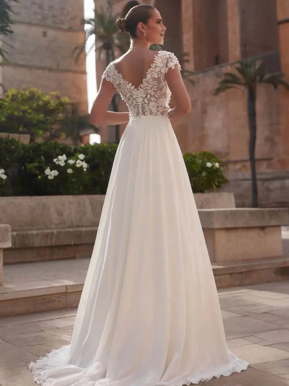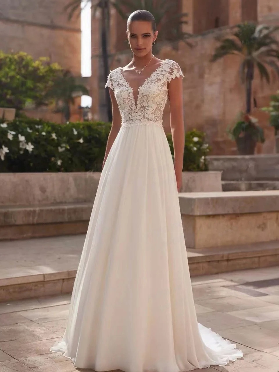 Au cœur d’un décor aux lignes architecturales et à la lumière chaleureuse, cette robe de mariée révèle une élégance naturelle et raffinée. Son corsage en dentelle florale délicatement travaillée, souligné par un décolleté en V profond et des épaules légèrement structurées, met en valeur le buste avec féminité. La taille est subtilement marquée, laissant s’épanouir une jupe longue et fluide au tombé léger qui accompagne chaque mouvement avec grâce. Cette robe séduit par son équilibre entre romantisme et modernité, idéale pour une cérémonie élégante en extérieur. Elle s’harmonise parfaitement avec des bijoux fins, une coiffure épurée et des accessoires délicats pour une allure lumineuse et intemporelle.