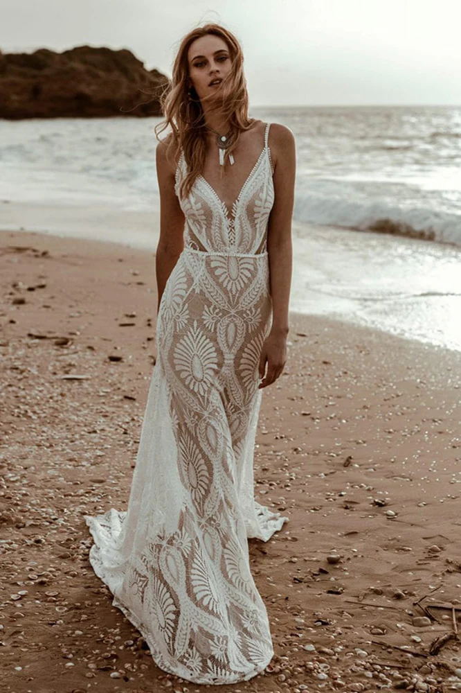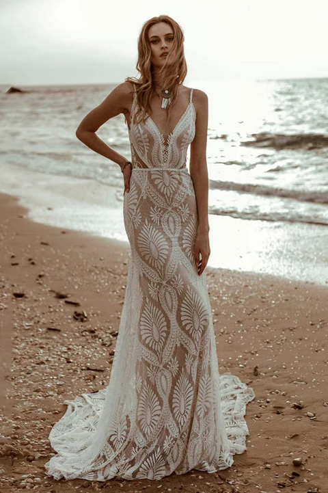 Sur une plage sauvage balayée par la brise marine, cette robe de mariée affirme un style bohème audacieux et sensuel. Sa coupe près du corps épouse la silhouette avec élégance, tandis que la dentelle graphique aux motifs solaires joue subtilement avec la transparence. Le décolleté en V profond et les fines bretelles apportent une touche de légèreté et de modernité. La jupe fluide se prolonge délicatement dans le sable, renforçant l’allure libre et naturelle de la robe. Parfaite pour une cérémonie en bord de mer, elle se sublime avec des bijoux minimalistes, des sandales plates ou pieds nus, et une coiffure naturelle pour un esprit résolument bohème.