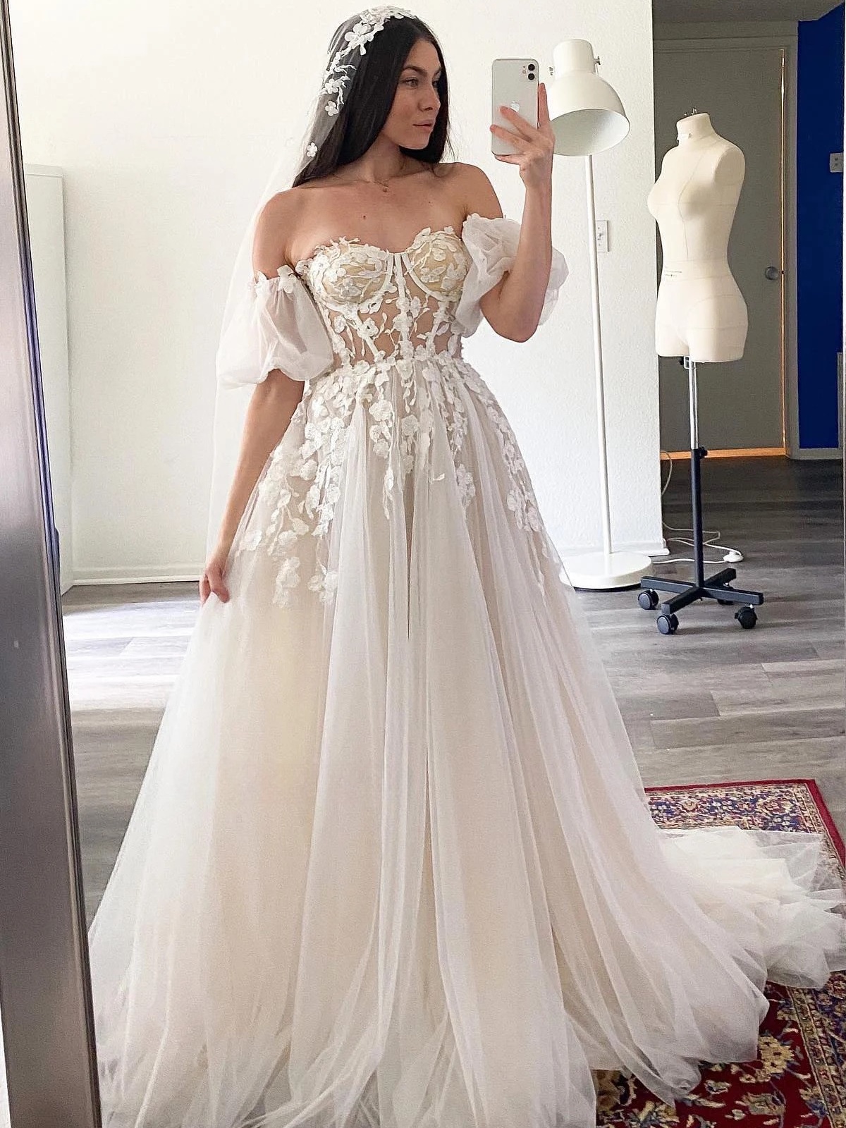 • Appliques florales et plis délicats