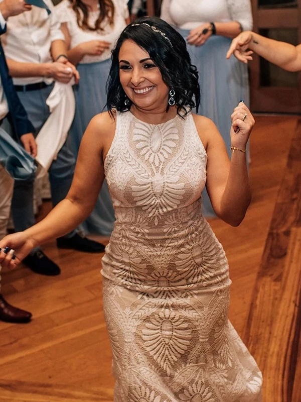 Une robe élégante et solaire, pensée pour les mariées qui souhaitent allier modernité et naturel. Cette robe de mariée séduit par sa coupe près du corps et par sa dentelle graphique aux motifs végétaux, qui épouse la silhouette avec finesse et caractère. Le col haut apporte une touche contemporaine et raffinée, tandis que la ligne élancée de la jupe allonge naturellement la silhouette. Le tissu souple accompagne les mouvements avec légèreté, créant une allure à la fois féminine et assurée. Le sable doux, la mer calme et la lumière dorée enveloppent la scène d’une atmosphère intime et chaleureuse, mettant en valeur l’esprit romantique, libre et authentique de cette création pensée pour un mariage les pieds dans le sable.