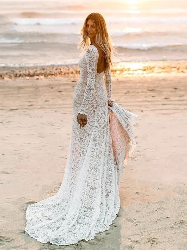 • Robe de Mariée Bohème en Dentelle Décolleté dans le Dos
