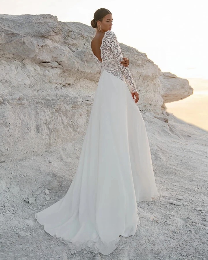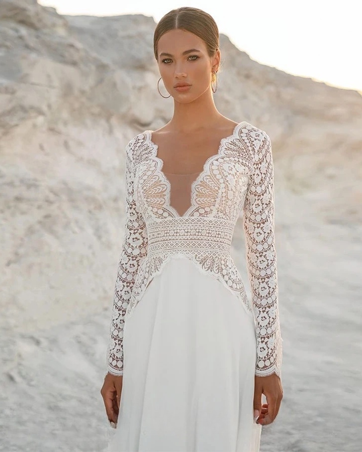 Robe de mariée bohème et lumineuse, cette création incarne une élégance naturelle et résolument féminine. Son décolleté en V profond, délicatement travaillé en dentelle graphique, sublime le buste avec finesse, tandis que les manches longues entièrement ajourées apportent une touche de raffinement et de modernité. La taille délicatement soulignée affine la silhouette et s’ouvre sur une jupe fluide et épurée, offrant un mouvement léger et une allure aérienne. La robe se dévoile dans un décor minéral aux teintes claires et naturelles, renforçant son esprit bohème et authentique. Pour sublimer ce modèle, privilégiez des sandales fines, des bijoux discrets et une coiffure naturelle ou élégamment relevée, afin de conserver une allure chic, lumineuse et intemporelle.