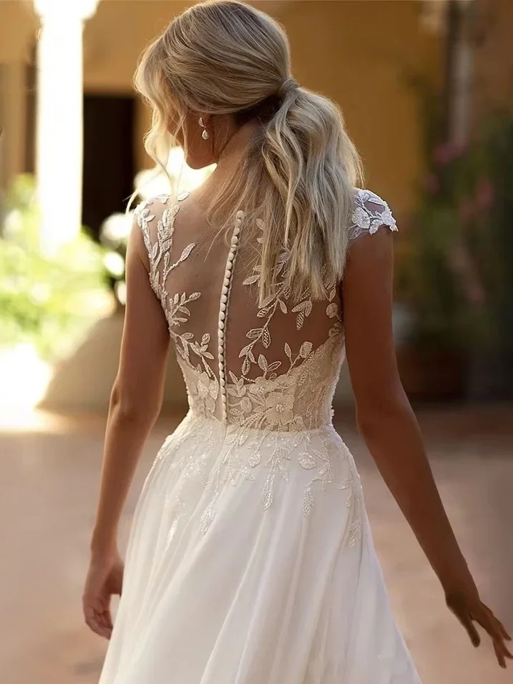 Robe de mariée bohème chic et résolument féminine, cette création séduit par son élégance légère et son allure moderne. Son corsage délicatement travaillé en dentelle florale met en valeur un décolleté en V raffiné, tandis que les petites manches apportent une touche de douceur et de romantisme. La taille marquée affine la silhouette avant de s’ouvrir sur une jupe longue et fluide, sublimée par une fente élégante qui allonge la jambe et apporte une note sensuelle parfaitement maîtrisée. Le tissu aérien accompagne chaque mouvement avec grâce, créant une silhouette élancée et lumineuse. La robe s’inscrit dans une atmosphère chaleureuse et méditerranéenne, entre sol en pierre, lumière douce et végétation discrète, idéale pour un mariage en plein air. Pour sublimer ce modèle, privilégiez des sandales fines, des bijoux délicats et une coiffure naturelle ou légèrement ondulée, pour une allure élégante, libre et intemporelle.